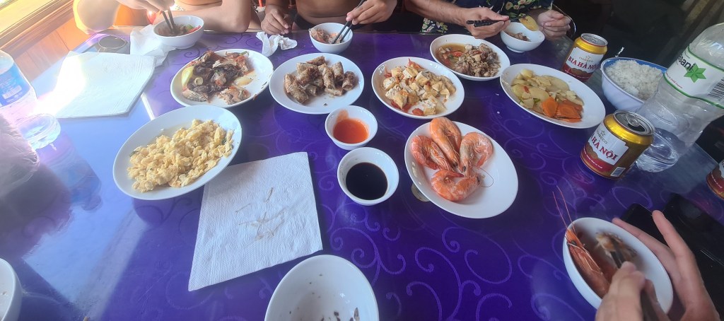 My final day in Cao Bang and I finally made it on the HaLong Bay cruise. A day full of pretty scenery, kayaking, jumping off boats, swimming with fishes and wonderful beaches. With the most beautiful lunch I’ve had in Vietnam included! A spread of fried fish, chicken, pork, spring rolls, rice and soup! The day finished with dinner with friends from the cruise, before an early night (me actually passing out in bed in my day clothes, clearly I needed the sleep).