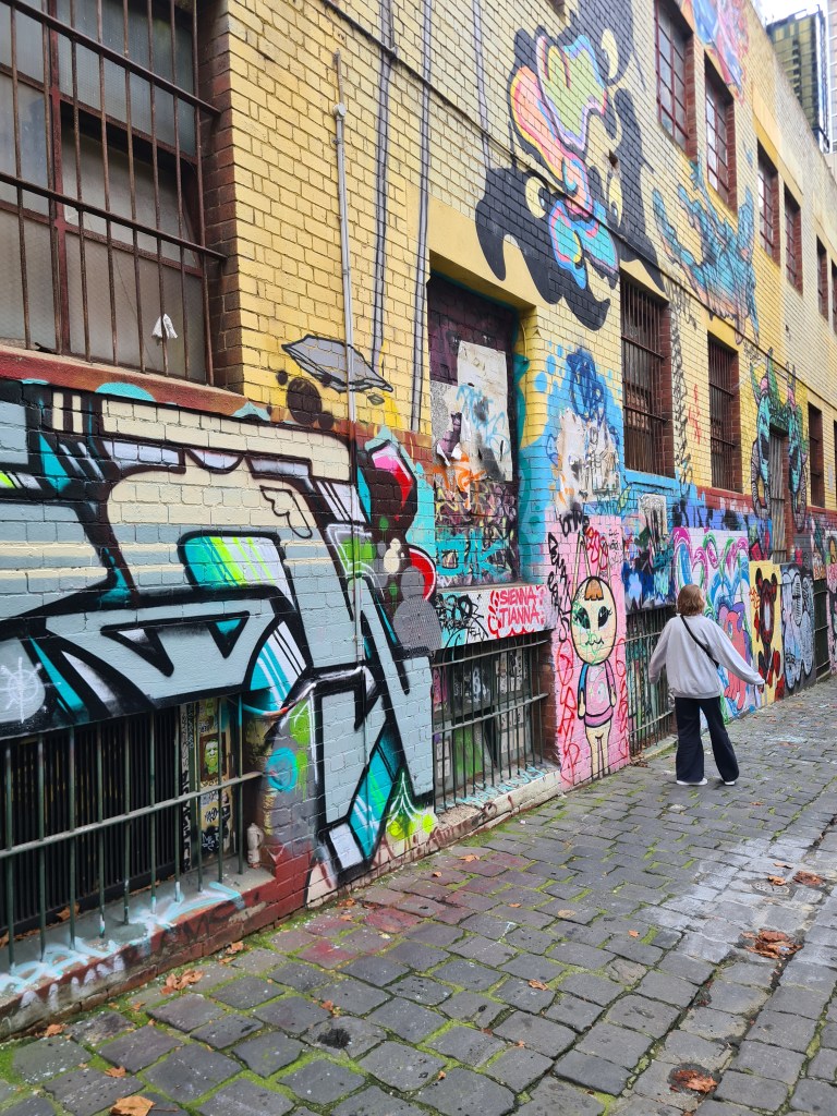 Our first day in Melbourne involved wandering the streets of Fitzroy, a very cool and quirky place with more edgy shops than you’d care to see. A spot of shopping, treating myself at last to some cargo pants. And witnessing some very cool street art.