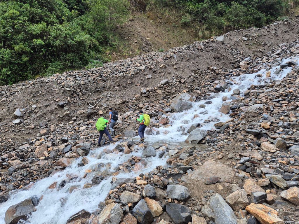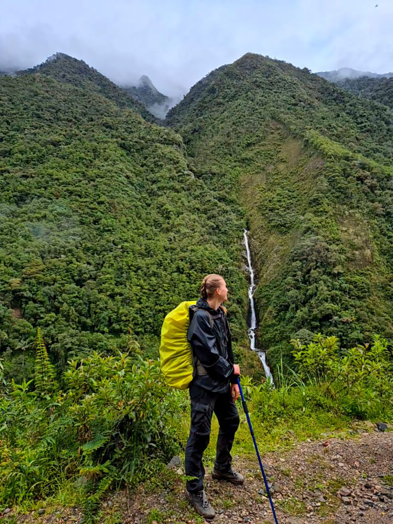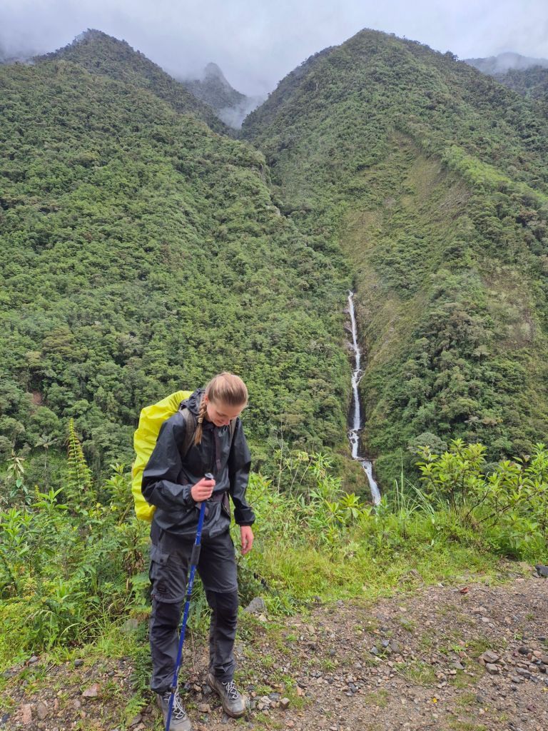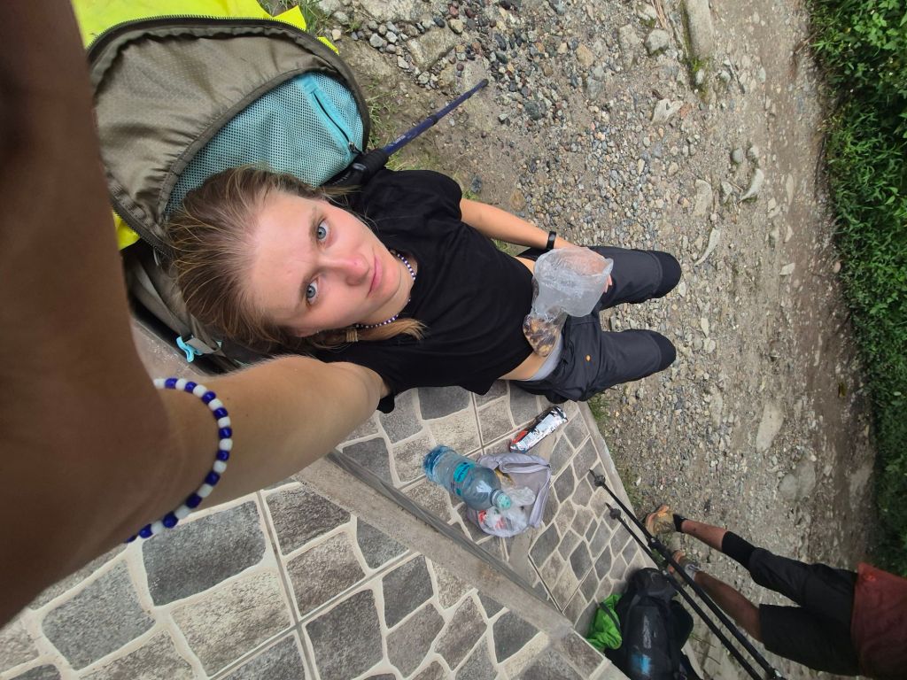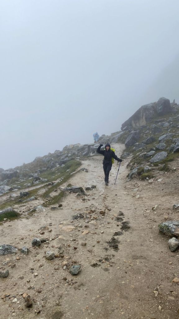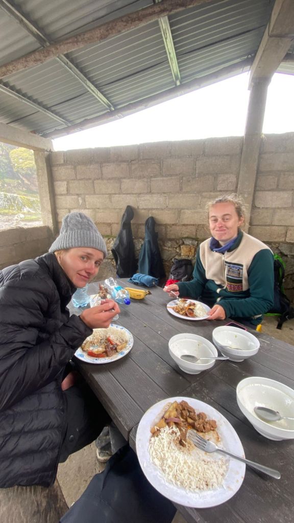 Day two began with an early start and an interesting breaky of a strange oatmeal like meal, I ate it anyway due to the energy needed, but it was a very odd consistency! It was a 20km hike day, starting with some mild rain and carley kicking off about the mud (it had rained a lot overnight). Then the rain started to get crazy heavy, and from here, we got colder, lol. Part of the hike is at 4600 meters, and at this point, I thought I’d get frost bite. We got soaked for hours, yet we all managed to keep up the morale. For Carley, this ended, when at a river crossing she fell in, i attempted to help but subsequently got half dragged in, too, lol. Her reaction was quite funny, and she just walked through the rivers from then on. It might not sound funny to read, but we all laugh a lot now! We had a lunch break, where we made tea and brought a quick meal. However, of course, by stopping, we all got cold and morale dipped temporarily! The rain luckily stopped, but just 1 hour before the end of the walking day, it was very typical but at least meant we could enjoy the end of the day and finally got some good views! We arrived at our hostel and had a warm shower before playing more games and having some more giggles. We had dinner and met back up with 2 other people from the hostel the night before, where we all discussed the days ahead! We then all headed to bed, but not before the kind lady offered to dry our shoes for us!