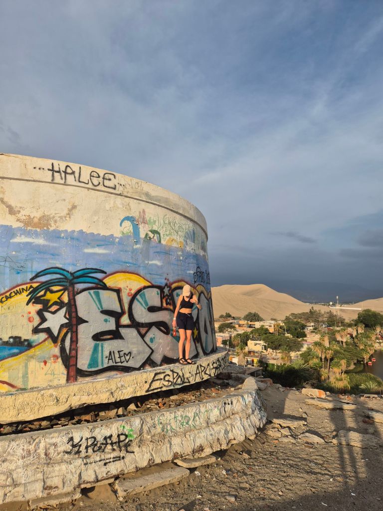 The night bus to Ica was going well until 6 am when we hit traffic and realised we’d be spending a lot of time in it. 5 days before flash flooding had hit southern Peru, and Nazca was still dealing with the consequences. A bridge had become unstable and was now one way, controlled by the police. It took us a total of 6 hours to cross the bridge before continuing another 2 hours to Ica. The journey took 19 hours instead of 13, and it’s fair to say we were tired! We then got a tuk tuk to Huacachina, where we learnt of more flash flood devastation as we had to walk the last part due to a road closure… crazy. I had a bit of a flu as well, so this was not what I needed. Luckily, we arrived and checked in to the hostel, and soon we sat in a restaurant having lasagne and garlic bread, and things were okay in the world again. The evening was spent hiking up the sand dunes to watch the sunset, taking some cool pictures along the way. Before heading for a smoothie and to our beds, after a very long and sleepless 24 hours!
